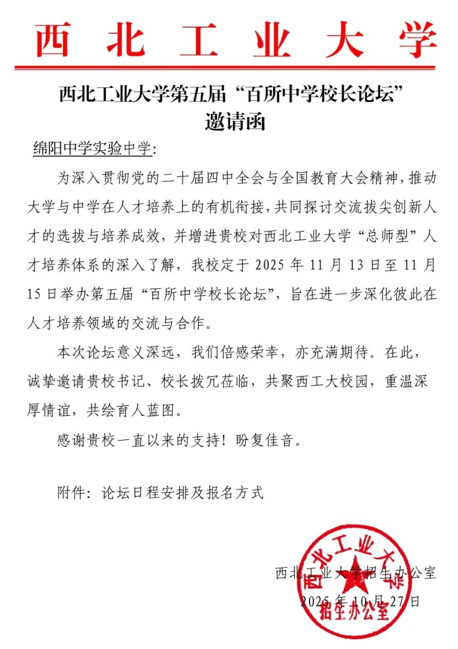 绵阳中学实验学校受邀参与此次高规格论坛,充分彰显了学校在办学业绩与人才培养方面的广泛认可。通过此次交流,我校更加深刻地把握了高等教育发展的前沿趋势与人才需求动向,也为学生未来进入西工大等顶尖学府拓宽了路径。学校将以此为契机,持续深化教育教学改革,强化与西北工业大学等国内知名高校的协同合作,用心培育更多兼具大胸怀、大格局与真本领的新时代创新型拔尖人才。
