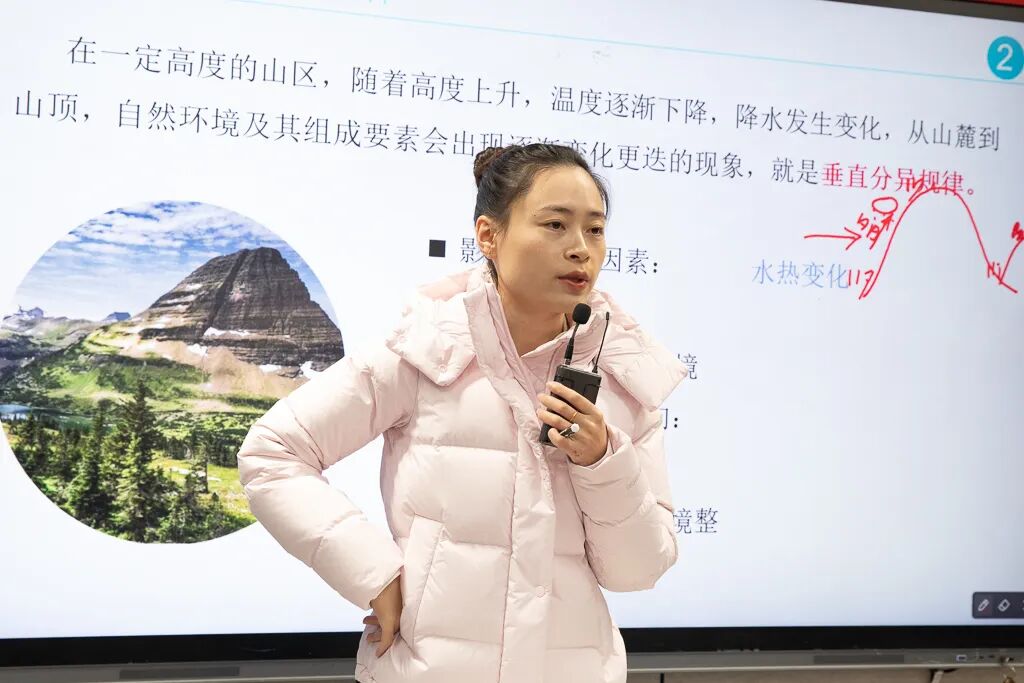 地理组注重实践能力与技术融入。何祎欣老师以数字AI视频引入《风沙地貌》,引导学生自主探究风力作用差异。陈斯瑶老师指导学生手工制作背斜、向斜模型,在动手实践中理解地质构造。陈红老师通过绘制山地垂直带谱图,帮助学生掌握地域分异规律。黄洁敏老师以东北黑土保护为切入点,结合AI视频动态展示,将土壤知识与粮食安全、生态保护等现实问题紧密联系。
